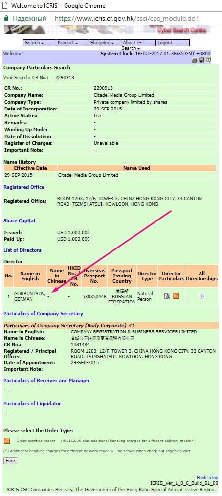 У фирмы Citadel Media Group LTD, которой принадлежат ресурсы Горбунцова, есть сайт. Он примечателен тем, что на его главной странице нет ни одной гиперссылки. На сайте лишь указано, что основной офис фирмы находится в Гонконге (по тому самому адресу).