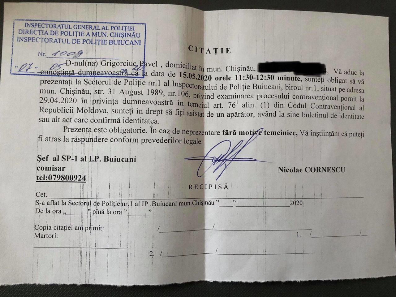 «Прислали повестку в полицию на 15 мая. Хотят составить протокол и оштрафовать за флешмоб, который мы провели 29 апреля у памятника Штефану чел Маре, соблюдая все нормы предосторожности, дистанцию в 1,5-2 метра и используя все необходимые средства защиты, передает moldnews.md