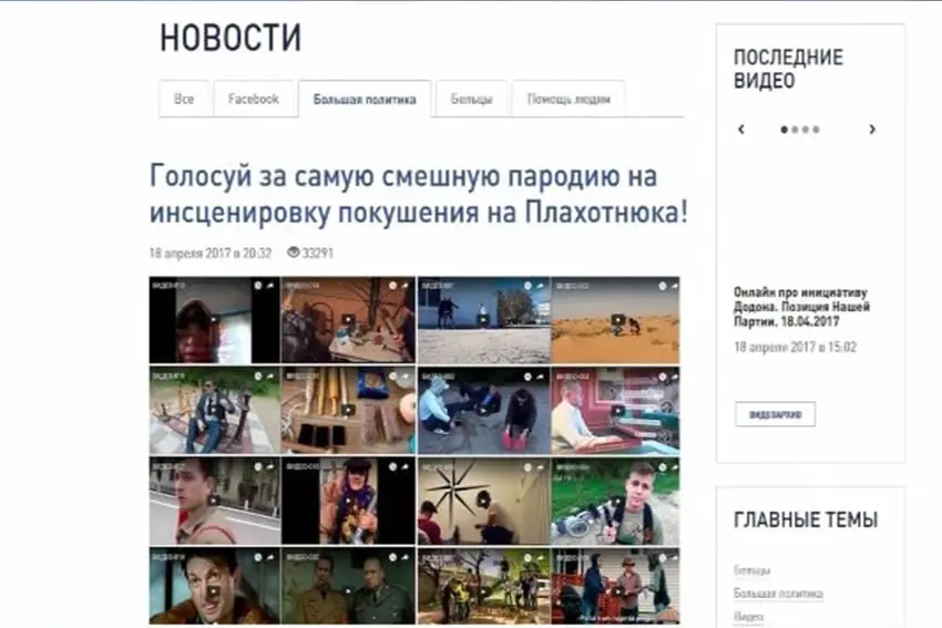 Во вторник завершился сбор видео на самую смешную пародию инсценировки покушения на олигарха Владимира Плахотнюка. Инициатором конкурса с призовым фондом в 200 тыс. леев стал мэр Бельц Ренато Усатый. В проекте были представлены 20 видеороликов, авторы которых показали свою, ироничную версию того, как именно планировалось покушение на лидера ДПМ. Тройку победителей, которые получат денежные призы, определят результаты интернет-голосования.
