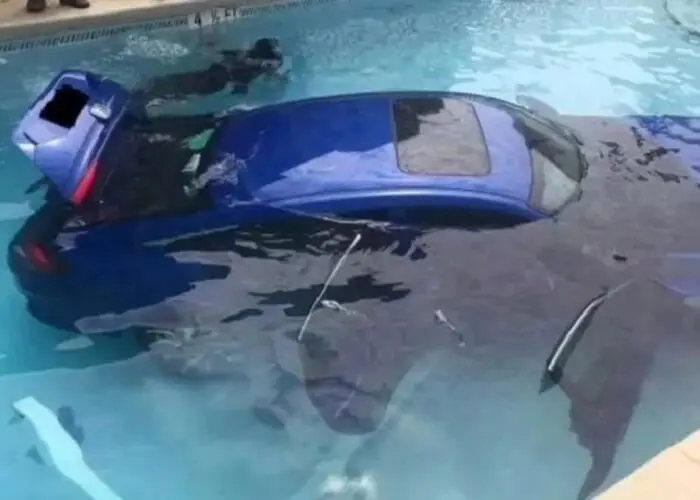 Acest lucru a înrăutățit situația, pentru că în timp ce ea s-a întors după bani, a uitat să ridice frâna de mână, iar mașina a plecat singură spre piscină, unde s-a scufundat.
