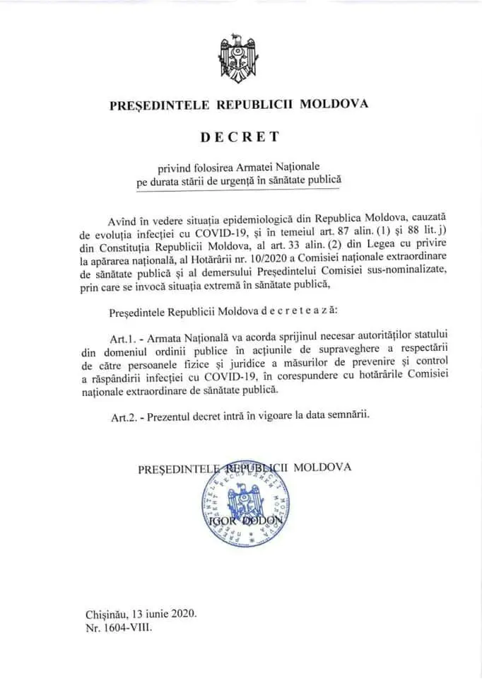 В связи с большим количеством случаев заражения коронавирусом нового типа президент страны Игорь Додон подписал указ об участии Национальной армии в оказании необходимой поддержки органам общественного порядка, передаёт Point.md
