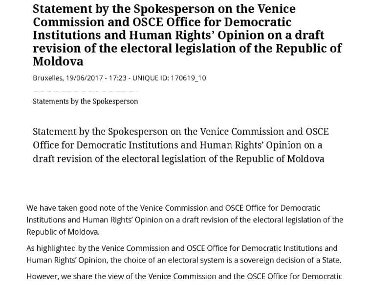 Подчеркивая отсутствие консенсуса по вопросу изменения избирательной системы в Молдове этой законодательной инициативе, Евросоюз согласен с мнением Венецианской комиссии и Бюро ОБСЕ по демократическим институтам и правам человека о том, что «несмотря на суверенную прерогативу страны, такие фундаментальные изменения нецелесообразны в этот раз».