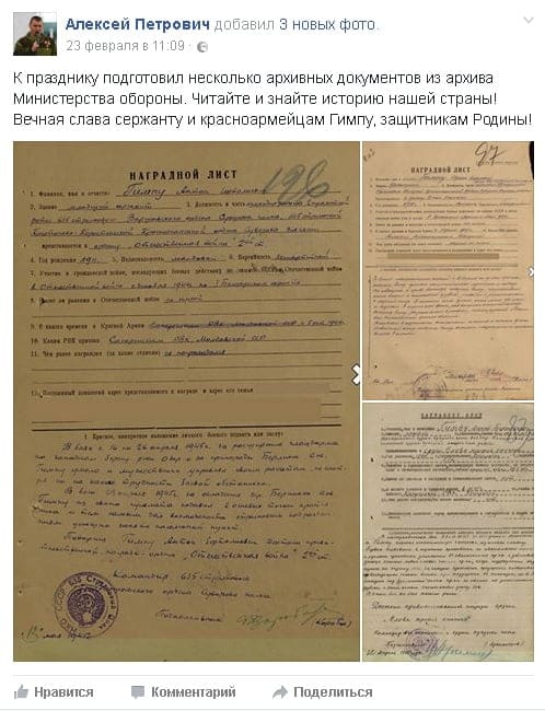 “В архиве Министерства обороны России я обнаружил несколько наградных листов периода Великой Отечественной войны. В одном из них речь идет о младшем сержанте Антоне Гимпу, который был награжден орденом Отечественной войны второй степени”, — рассказал Петрович.