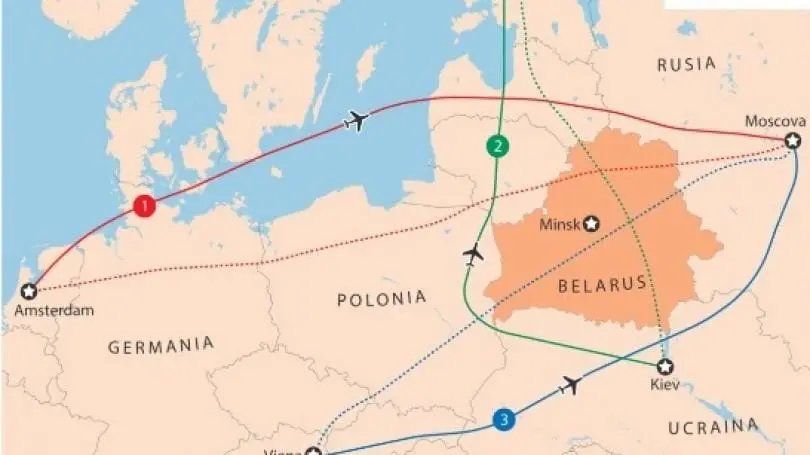 Într-un infografic realizat de Radio Europa Liberă se pot vedea cum sunt redirecționate rutele aeriene ca să ocolească spațiul aerian al Belarus.