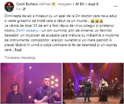 „Dimineața de azi a început cu un apel de la doctor care ne-a adus o veste groaznic de tristă care a căzut ca un munte. La vârsta de doar 33 de ani a fost răpus de virus colegul și prietenul nostru Dorin Ieșeanu – un om cuminte, plin de omenie, un familist deosebit, un muzician de excepție care mânuia cu măiestrie o mulțime de instrumente, compozitor, aranjor, sunetist și un mare patriot! A plecat lăsând în urmă o soție iubitoare, la fel de talentată, și un copilaș care-i seamănă leit”, a menționat în mesajul său interpretul Costi Burlacu.