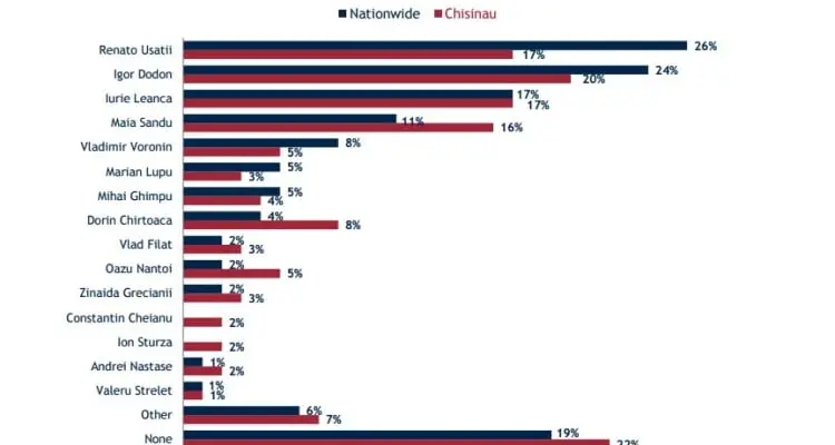 За ними следуют Юрий Лянкэ с 17 процентами, Майя Санду с 11-ю и Владимир Воронин, которому доверяют 8 процентов опрошенных. По 5 процентов у Мариана Лупу и Михая Гимпу.