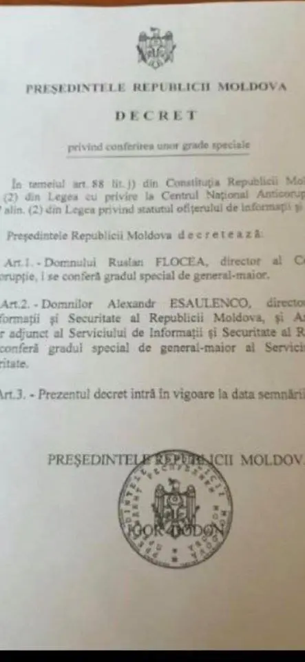 Ренато Усатый опубликовал в социальных сетях фото президентского указана, из которого следует, что Игорь Додон представил к званию генералов Руслана Флочу и Александра Есауленко.
