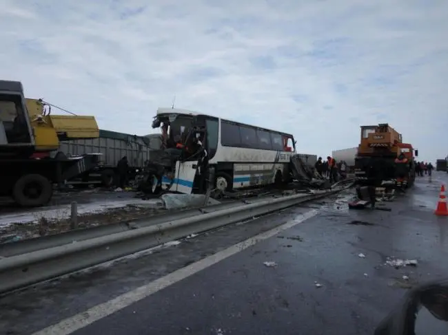 Как оказалось, на трассе столкнулись 6 транспортных средств. Водитель молдавского рейсового автобуса Setra сообщением «Москва — Кагул» не справился с управлением ( предварительная версия — гололедица) и въехал в грузовые машины «ДАФ» и «МАН». От удара автобус перевернулся, и с ним столкнулся еще один «ДАФ», в который в свою очередь врезались легковой автомобиль «Шевроле вид» и микроавтобус «Мерседес Вито».