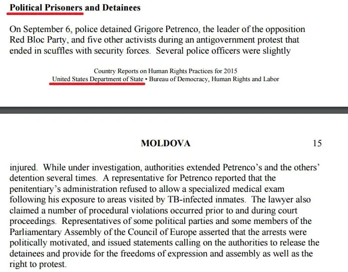 «Представитель Петренко сообщил, что администрация тюрьмы отказывала ему в медицинском обследовании даже после того, как он был помещен в места, предназначенные для больных туберкулезом заключенных. Представители ряда политических партий, а также члены Парламентской ассамблеи Совета Европы настаивали на том, что арест был политически мотивирован и выступили с заявлениями к властям с требованием освободить заключенных и обеспечить их права на свободу слова, на собрания, а также право на протест», — подчеркивается в Докладе Госдепартамента США по нарушениям прав человека в Молдове.