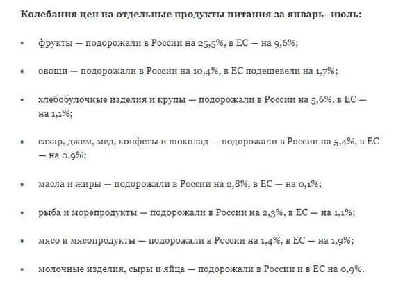 Так, стоимость продовольствия подскочила в апреле в связи с распространением коронавирусной инфекции: в РФ — на 2,2%, в ЕС — на 1,3%. В мае-июне в России цены выросли на 0,1%, в июле снизились на 0,1%. В ЕС в мае цены выросли на 0,3%, в июне снизились на 0,4%, через месяц — упали на 1,3%.