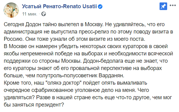 Усатый отмечает, что «в Москве Додон намерен убедить некоторых своих кураторов в своей якобы непременной победе на выборах и необходимости всяческой поддержки со стороны Москвы».