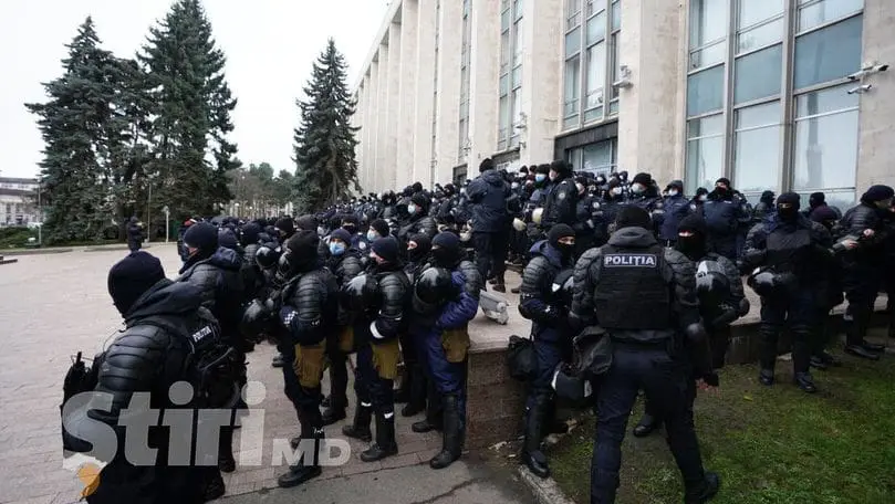Din imaginile surprinse de fotograful Știri.md, se observă că polițiștii sunt organizați în nu mai puțin de 5 rânduri.