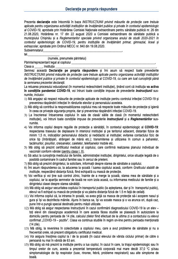 Părinții preșcolarilor și școlarilor sunt obligați să semneze o declarație pe propria răspundere. Documentul a fost elaborat de Ministerul Educației. Acesta enumeră responsabilitățile părinților cu privire la siguranța copilului în transportul public și într-o instituție de învățământ.