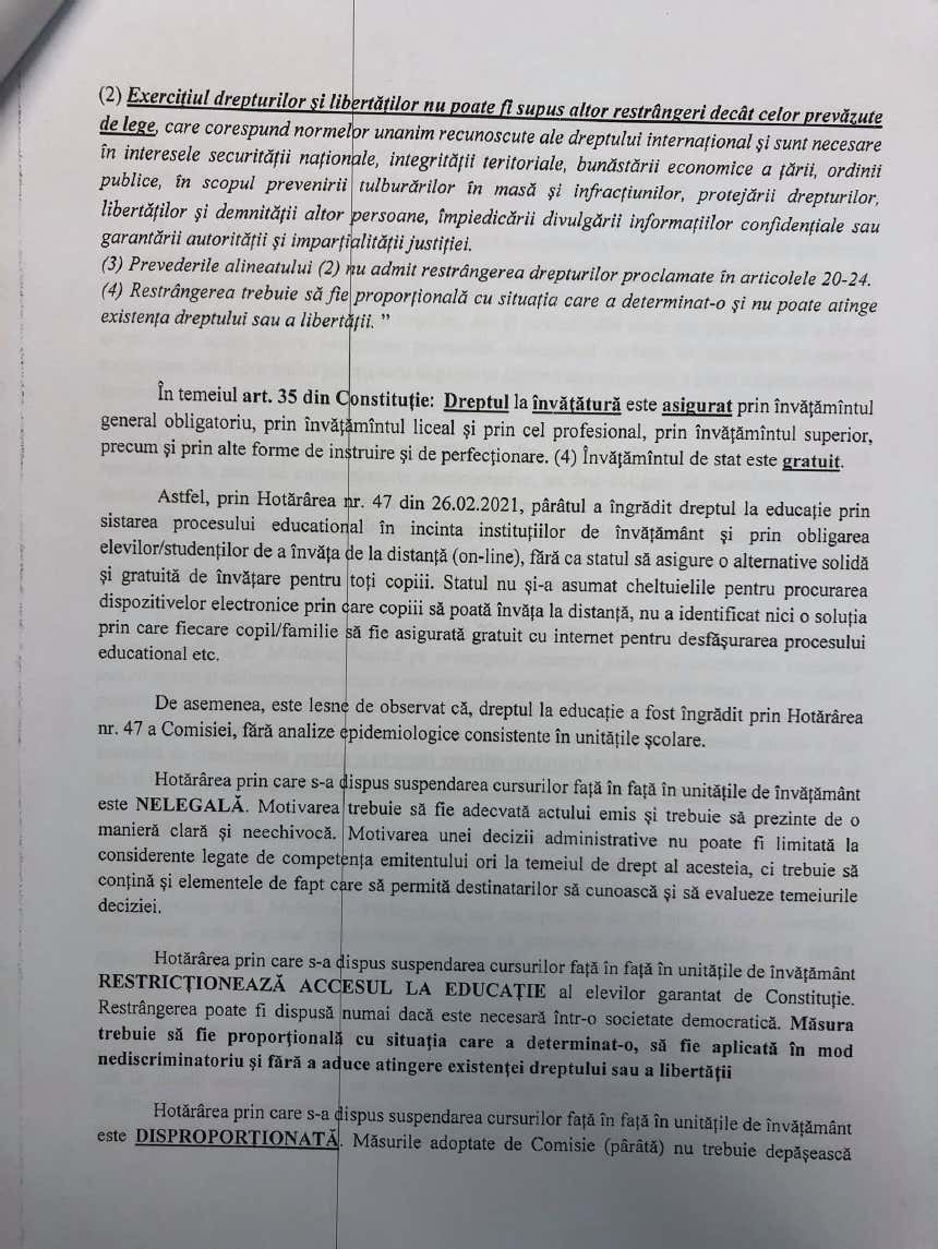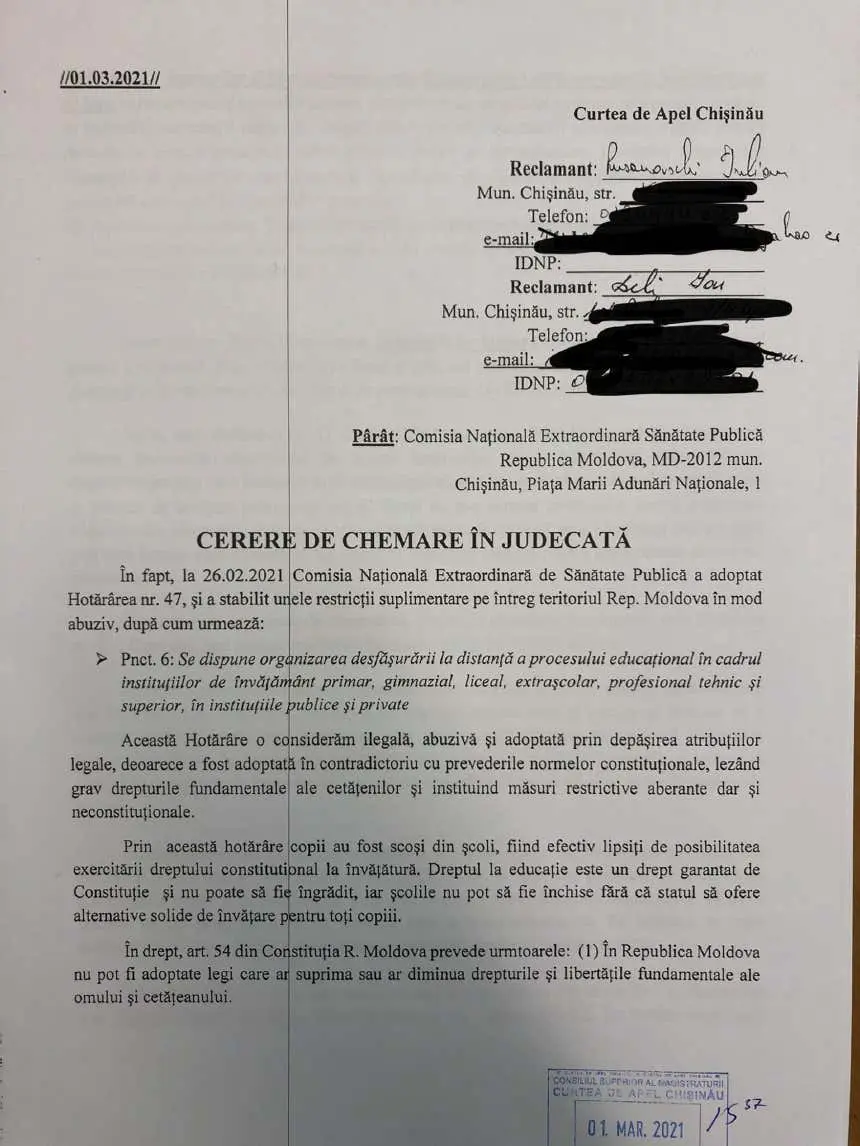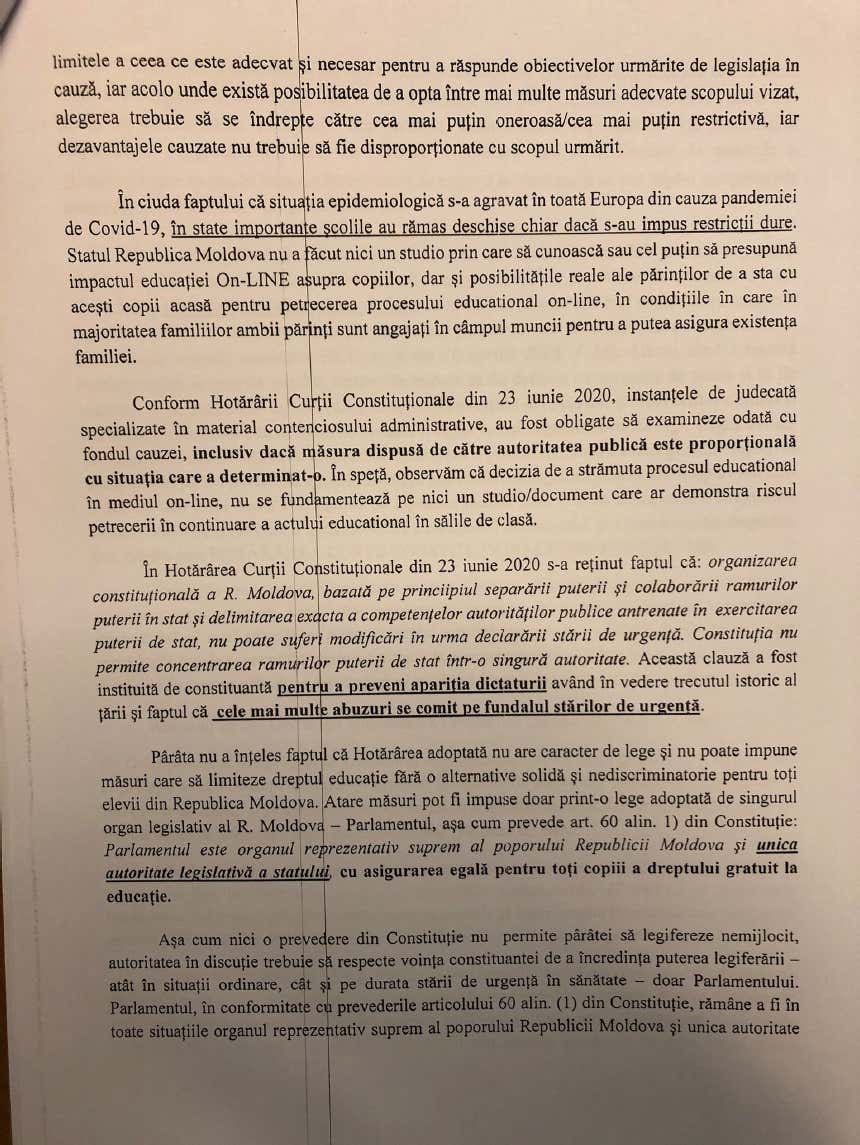 „Biroul nostru de avocați a contestat în instanța de judecată Hotărârea prin care CNESP a interzis desfășurarea procesului educațional în sălile de clasă și a obligat copiii să treacă la educația on-line, fără să asigure fiecare elev cu dispozitiv electronic conectat la internet. Statul este incapabil să asigure continuarea nediscriminatorie a tuturor tinerilor din R. Moldova, iar aceasta Hotărâre este ilegală și abuzivă”, susțin reprezentanții biroului de avocați.