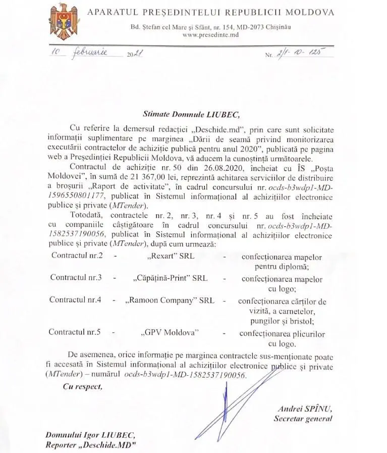 La fel, am atras atenția și asupra altor contracte de achiziție. Acestea au fost semnate în luna mai 2020, în perioada când infecția COVID-19 își continua răspândirea pe teritoriul R.Moldova, iar autoritățile anunțau despre creșterea numărului total de cazuri confirmate . Astfel, în perioada când în R.Moldova era valabilă starea de urgență, Guvernul mergea în Parlament pentru rectificarea bugetului și achita milioane de lei din Fondul de rezervă, Președinția a semnat, la data de 11 mai 2020, patru contracte cu cu mai multe companii tipografice – suma totală a acestora depășind 430 mii lei.