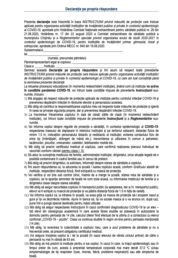 Înainte de a-și trimite copiii la școală, părinții vor semna o obligație pe proprie răspundere, pe care o vor prezenta ulterior conducerii instituției de învățământ, scrie agora.md