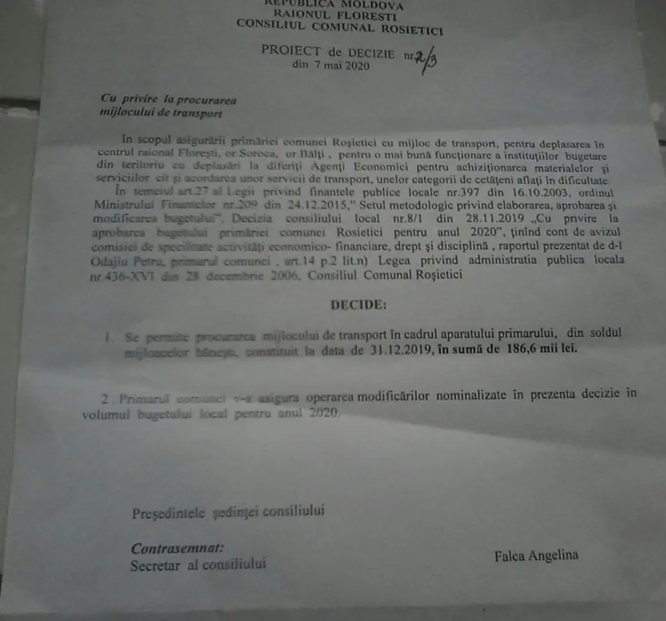 „O decizie „importantă” în timpul pandemiei este alocarea a 186 de mii de lei, bani din buget, pentru procurarea unui automobil pe care să-l folosească primarul comunei Roșietici, raionul Florești, Petru Odajiu”, susține Vasile Chivriga, consilier local.