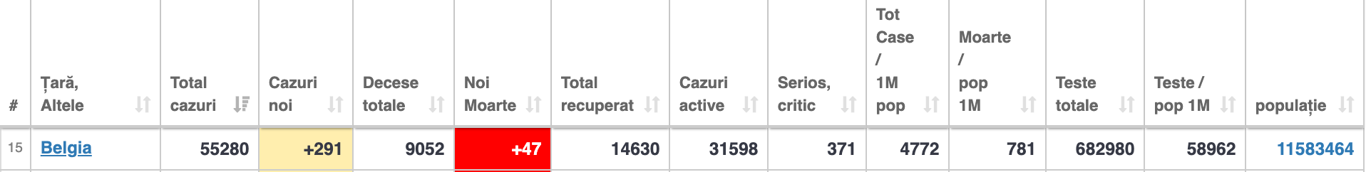 În prezent, Belgia înregistrează 55.280 de cazuri de îmbolnăvire cu noul coronavirus. Din cauza virusului, în această țară au decedat 9.052 de persoane. Alte 14.630 de cazuri au fost recuperate.