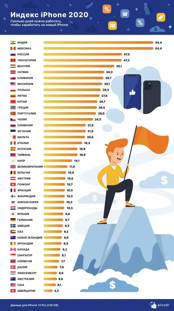 Аналитики портала Picodi провели исследование и узнали, в какой стране мира быстрее всего можно заработать на новинку от Apple — iPhone 12 Pro в версии 128 GB. Эксперты сравнивали цены на гаджет со средней зарплатой в нескольких десятках стран, результаты опубликованы на сайте Picodi, сообщает korrespondent.net.