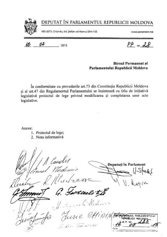 Разработка и принятие этого законопроекта были одним из первых публичных опытов сотрудничества с Демпартией олигарха Владимира Плахотнюка. От ДПМ в этой специально созданной рабочей группе были Андриан Канду и Владимир Андронаки. В ее же состав вошли и позже примкнувшие к ДПМ либерал Владимир Чернат и коммунист Петру Порческу. В группе авторов также были либерал Юрий Киринчук, осужденный за коррупцию, и либерал-демократы Валерий Стрелец и Виктор Рошка.