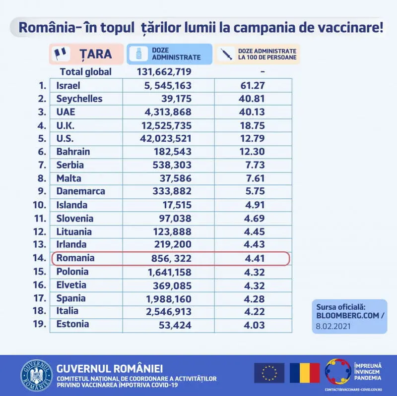 „În România se văd eforturile depuse în ultima perioadă, în ultimele săptămâni. Astfel că, pe o analiză efectuată şi publicată în cursul zilei de ieri, România se află pe locul 14 la nivel global, cu o rată de doze administrate la suta de persoane de 4,41 de doze, peste media europeană de 3,77 şi în faţa unor ţări care au sisteme de sănătate mult mai performante, mult mai eficiente, ţări precum Germania, Franţa, Italia, Polonia şi aşa mai departe. Analiza prezintă date din 73 de ţări şi în total până în momentul de faţă sunt peste 131 de milioane de doze administrate, chiar şi cu o medie de 4,7 milioane de doze pe zi la nivel global”, a afirmat Andrei Baciu, pentru Agerpres.