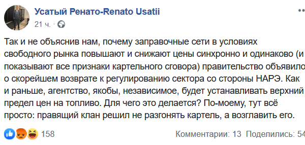 «Так и не объяснив нам, почему заправочные сети в условиях свободного рынка повышают и снижают цены синхронно и одинаково (и показывают все признаки картельного сговора) правительство объявило о скорейшем возврате к регулированию сектора со стороны НАРЭ. Как и раньше, агентство, якобы, независимое, будет устанавливать верхний предел цен на топливо. Для чего это делается? По-моему, тут всё просто: правящий клан решил не разгонять картель, а возглавить его», — написал Ренато Усатый.