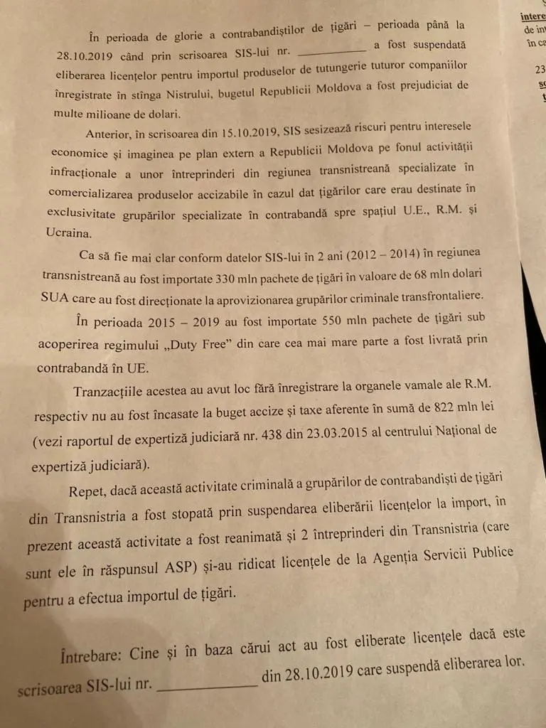 Мэр Бельц добавил, что спустя короткое время, а точнее, 28 октября, Есауленко отправил ещё одно письмо директору Агентства публичных услуг Мирче Ешану, в котором также просил приостановить выдачу лицензий на импорт табачных изделий.