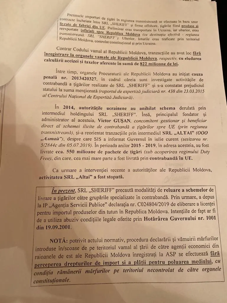 «15 октября Есауленко отправил Майе Санду доклад, в котором директор СИБа информирует премьер-министра о том, что в течение 2012-2014 г, под патронажем холдинга «Шериф» из Приднестровья, несколько компаний из Левобережья получили лицензию на ввоз сигарет на территорию Республики Молдова. В общей сложности речь идёт о 550 миллионах пачек сигарет, и всё это под прикрытием duty—free. Поэтому Есауленко рекомендует, чтобы Агентство публичных услуг больше не выдавало лицензию компаниям из Приднестровья на ввоз в Республику Молдова сигарет, поскольку эти сигареты предназначались для групп, специализирующихся на контрабанде в ЕС, как в Республике Молдова, так и на Украин», — сообщил Ренато Усатый и добавил, что после реакции руководства страны соответствующие компании не получили лицензии, «что могло бы означать, что контрабанда прекратилась», — отметил лидер НП.
