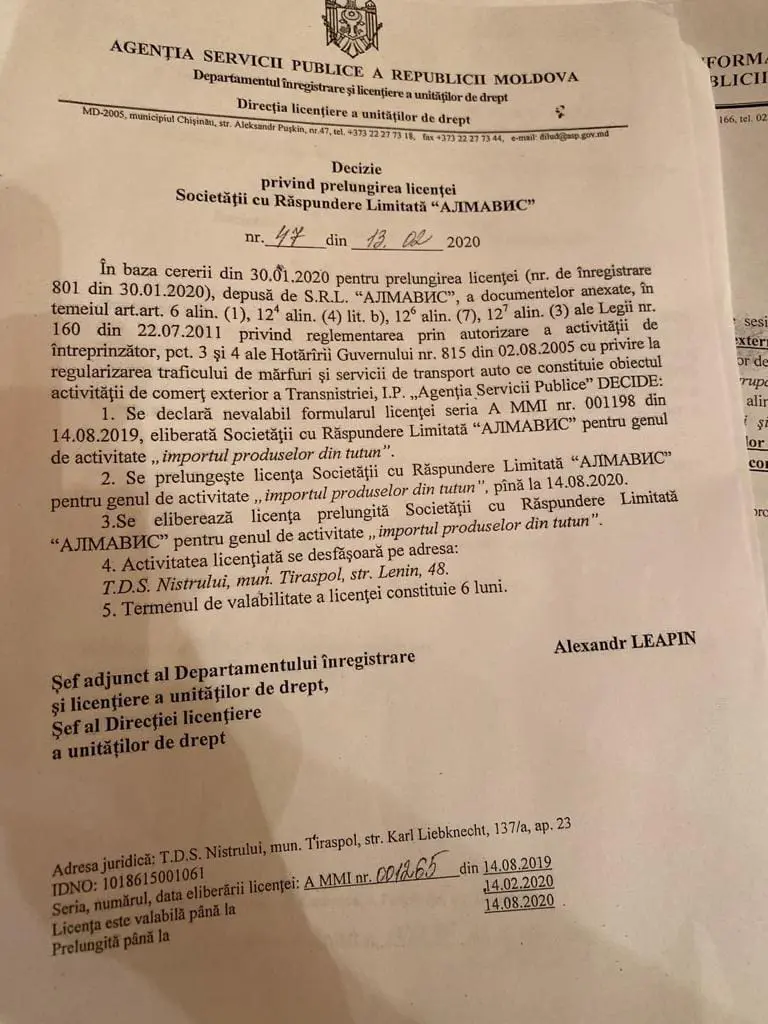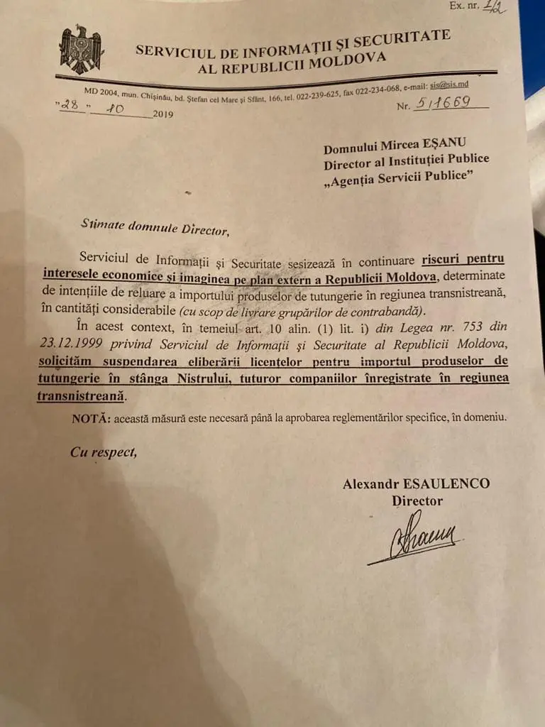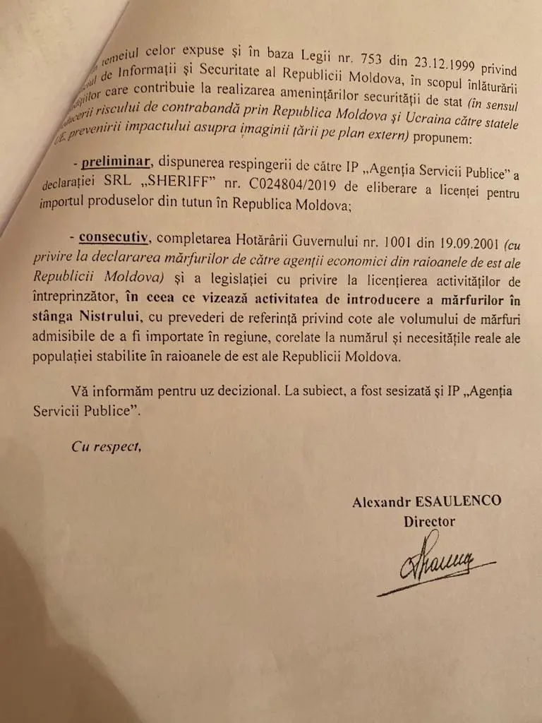 Мэр Бельц добавил, что спустя короткое время, а точнее, 28 октября, Есауленко отправил ещё одно письмо директору Агентства публичных услуг Мирче Ешану, в котором также просил приостановить выдачу лицензий на импорт табачных изделий.