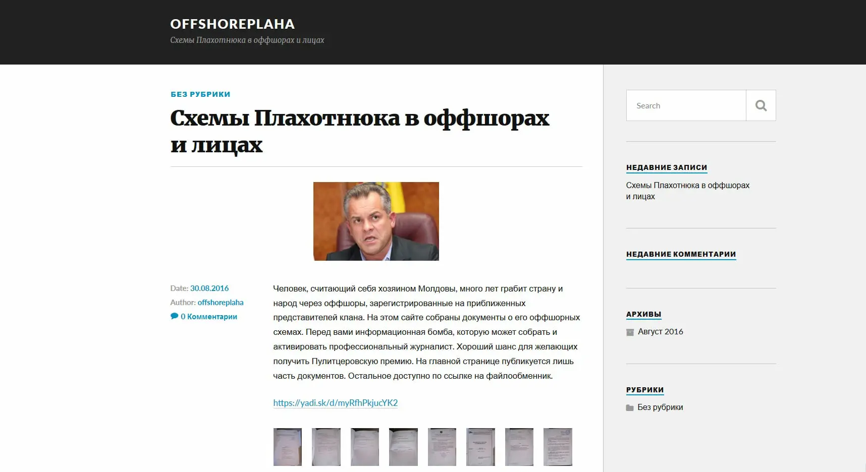 Лидер Нашей партии Ренато Усатый опубликовал на своей странице в социальной сети Facebook адрес сайта, на котором находится 3 гигабайта оригиналов документов о фирмах, контролируемых олигархом Владимиром Плахотнюком напрямую или через посредников. Ренато Усатый проинформировал, что данный портал он нашёл в интернете. Среди документов можно обнаружить и компании, зарегистрированные в оффшорных зонах.