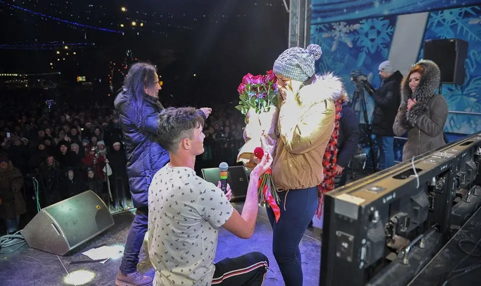 В Бельцах 31 декабря во время новогоднего концерта парень сделал предложение своей девушке. Трогательный момент запечатлели камеры телеканала БТВ. Молодой человек задал избраннице главный вопрос прямо на сцене, где в этот момент выступала группа «Норок».