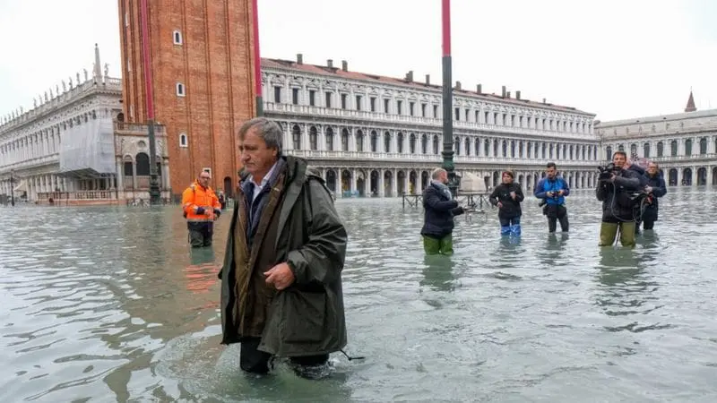 Мэр города Луиджи Брунгаро — на этом фото он идет по площади Святого Марка — заявлял, что в резких перепадах воды виновато глобальное потепление (снимок 2019 года).