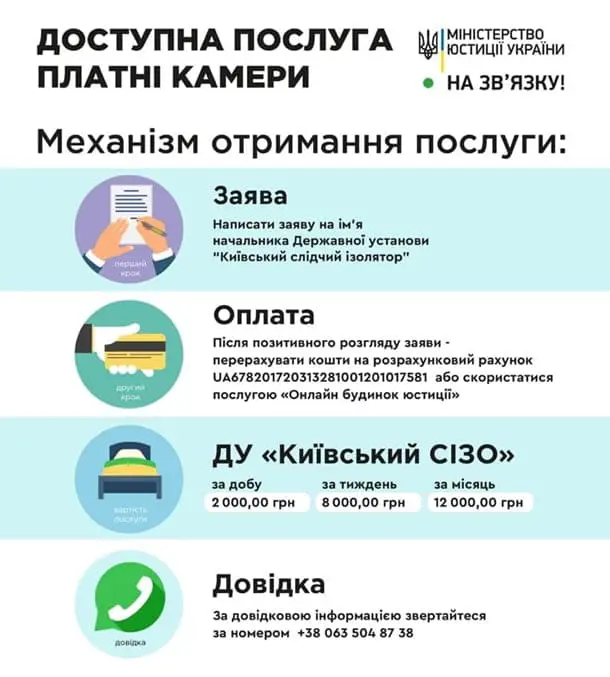 Министр юстиции Украины уточнил, что речь идет о следственных изоляторах, где содержатся люди, в отношении которых нет приговора суда и которые считаются невиновными в совершении преступления. Министерство юстиции открыло платные камеры с улучшенными условиями содержания в следственных изоляторах. Об этом сообщил глава Минюста Денис Малюська в Facebook, передаёт korrespondent.net.