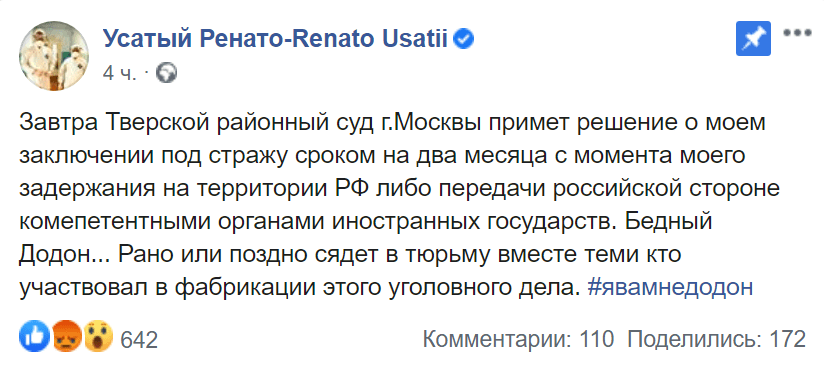 «Завтра, Тверской районный суд г.Москвы примет решение о моем заключении под стражу сроком на два месяца с момента моего задержания на территории РФ либо передачи российской стороне компетентными органами иностранных государств. Бедный Додон…